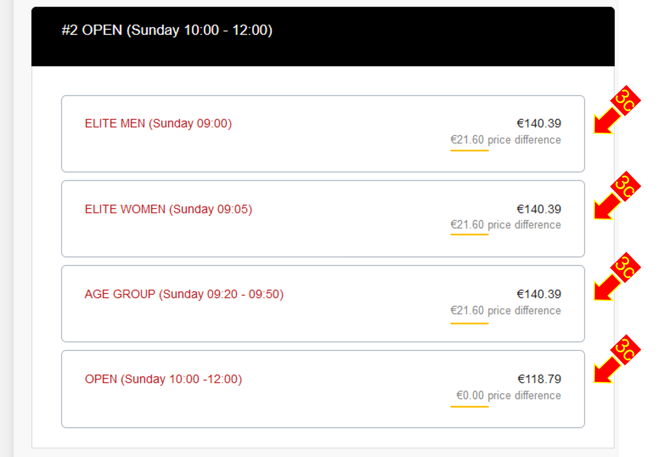 - Elige el bloque de tiempo que desees (3c) (Elite, Age Group, Open). Ten en cuenta que sólo podrás hacer la transferencia a las tandas que no estén agotadas.