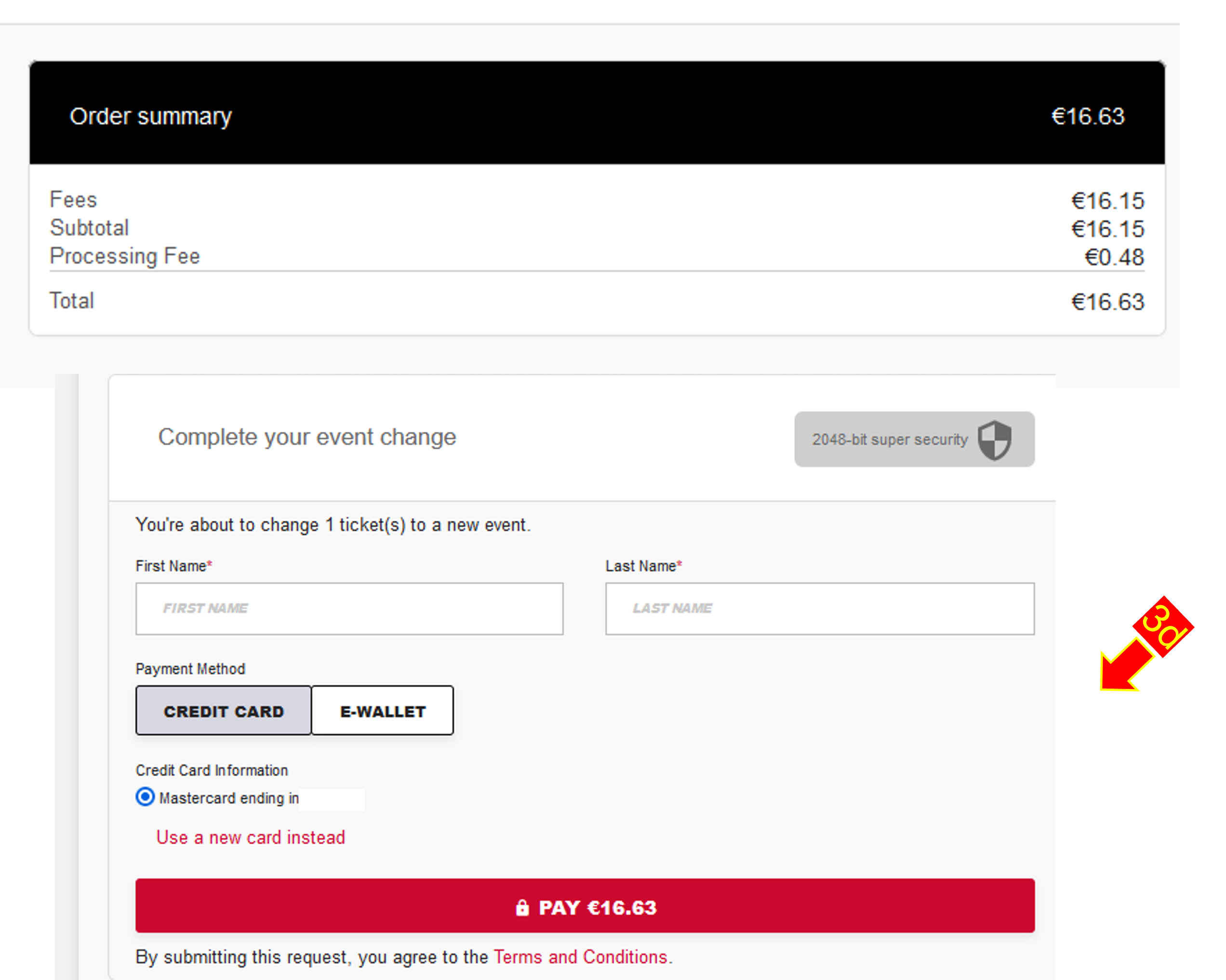 5. Aparecerán los cargos aplicables por la operación (2d). Introduce tus datos de pago. (2e)